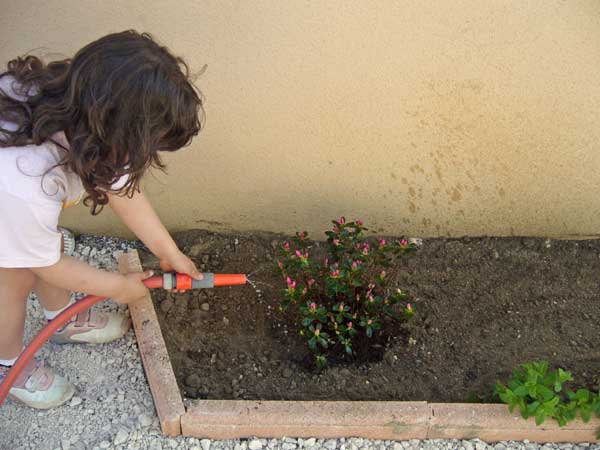 Une après-midi avec ma fille de 5 ans nous avons entrepris de planter deux azalées japonaises dans un petit coin de terre derrière le garage. Deux trous faits avec une bêche, bien de terre de bruyère au fond, on dépose délicatement les azalées, puis on recouvre de terre, on arrose enfin, et voilà un résultat bien sympathique, et une enfant toute fière de son travail !